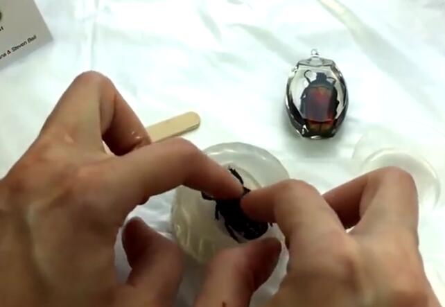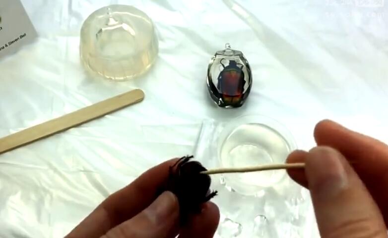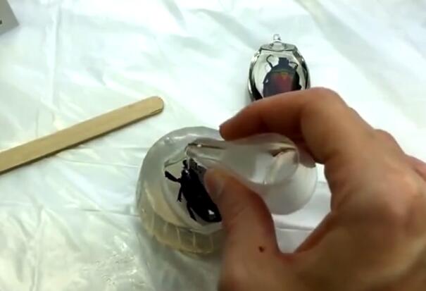 5、然后再硅膠模具上面鋪上小半層膠水,把蟲子放入里面。